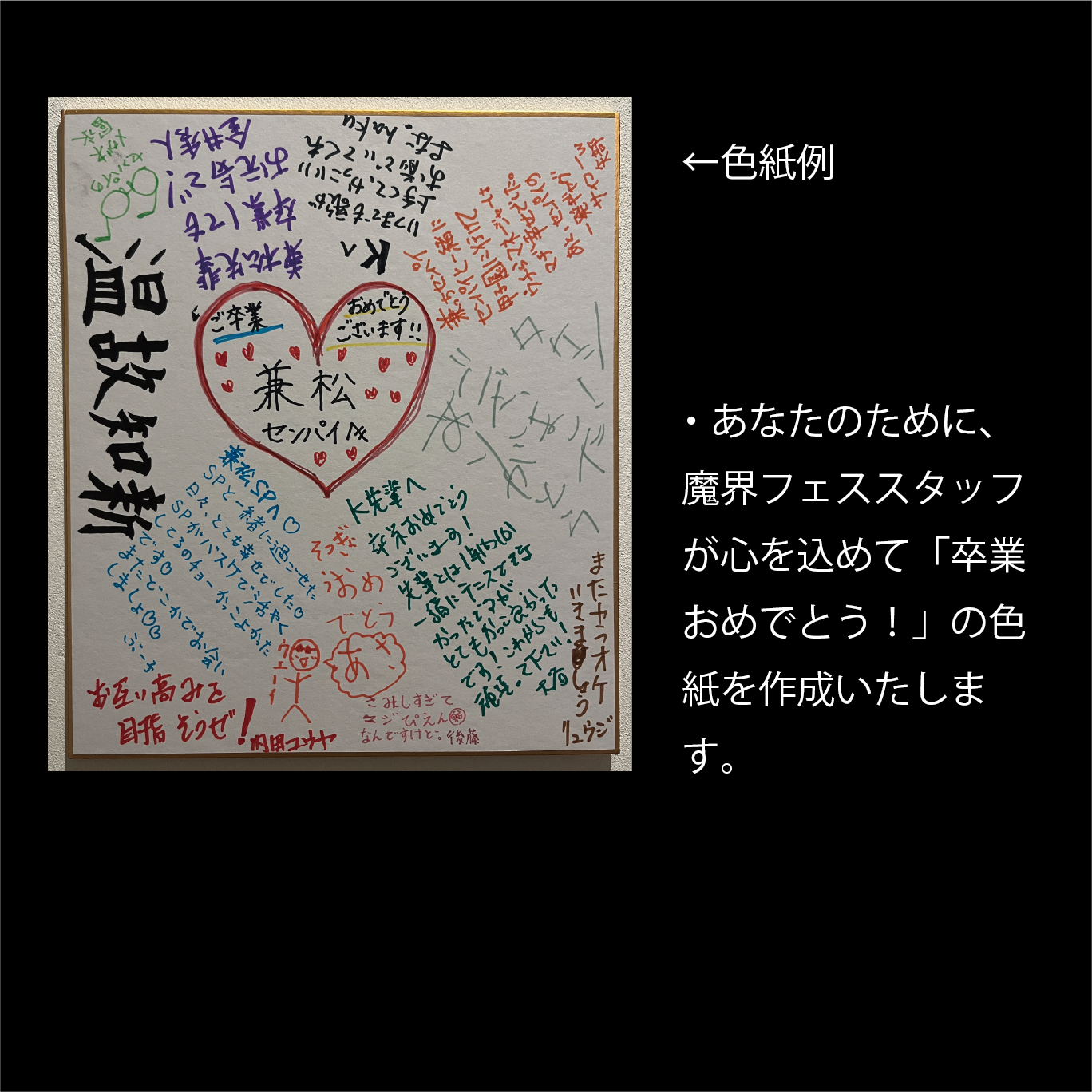 学生証、卒業証書(筒入り)、寄せ書き(特大)、チヤホヤ待遇、取り巻き数名、会場内飲み食べ放題